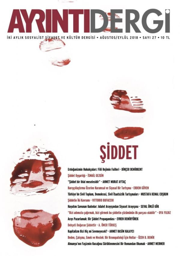 Yeni dönemle birlikte, uzun süredir toplumu saran şiddet olgusu daha da belirgin hale geliyor. Ayrıntı Dergi’nin bu sayısı, şiddeti odağına alarak, barış, demokrasi, adalet, sivil itaatsizlik gibi kavramların izinden gidiyor. Yalnızca toplumsal olayları veya siyasi müdahaleleri anlamak için değil, günlük hayattaki küçük ölçekli ama yaygın şiddeti ve onun toplumu nasıl içten içe çürüttüğünü kavramak için de okunması, tartışılması gereken yazıların yer aldığı bir dergi…
